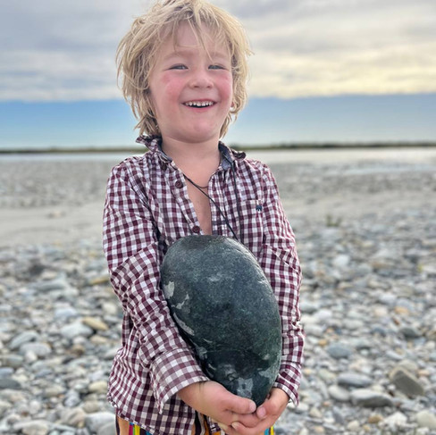 The Tauwhares also graciously granted us permission to set up camp along the idyllic banks of the river. It was there that young Jasper embraced his role as an explorer, while I attended to our nightly camp duties. I have to say, this boy really has an uncanny talent for discovering hidden treasures - look at the whopping piece of gorgeous pounamu he found! No one can deny that he's a real chip off the old block!