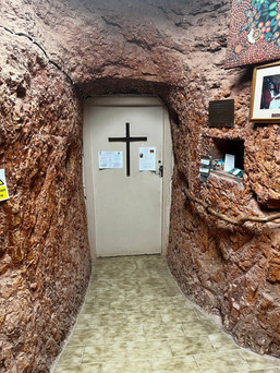 Arriving in Coober Pedy at the crack of dawn, the bus dropped me off at the local church. Half-asleep, I found solace outside the church's entrance, unknowingly settling down to catch up on sleep on the edge of the nearby graveyard. An unintended camping spot, to say the least! I gathered myself and eagerly awaited the arrival of the local miners, who would gather for the church service at 10 a.m. It's true that not many miners attend religious services anymore, but the chance to witness an underground chapel firsthand was definitely a worthwhile experience.